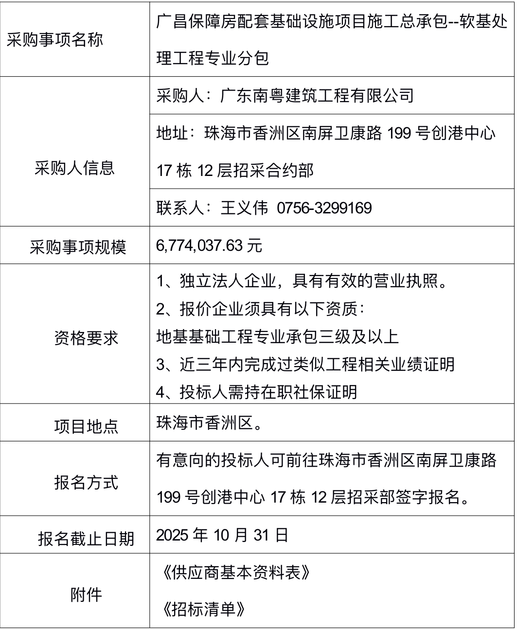 廣昌保障房配套基礎設施項目施工總承包--軟基處理工程專業(yè)分包 專欄:工程招標 發(fā)布日期: 2025-10-28 作者:招采管理中心 附件:供應商基本資料表 附件:廣昌保障房配套基礎設施項目施工總承包--軟基處理工程專業(yè)分包招標清單 返回列表 上一篇:廣昌保障房配套基礎設施項目施工總承包工程一切險、建筑施工企業(yè)安全生產(chǎn)責任保險(第二次) 下一篇:廣昌保障房配套基礎設施項目施工總承包工程一切險、建筑施工企業(yè)安全生產(chǎn)責任保險