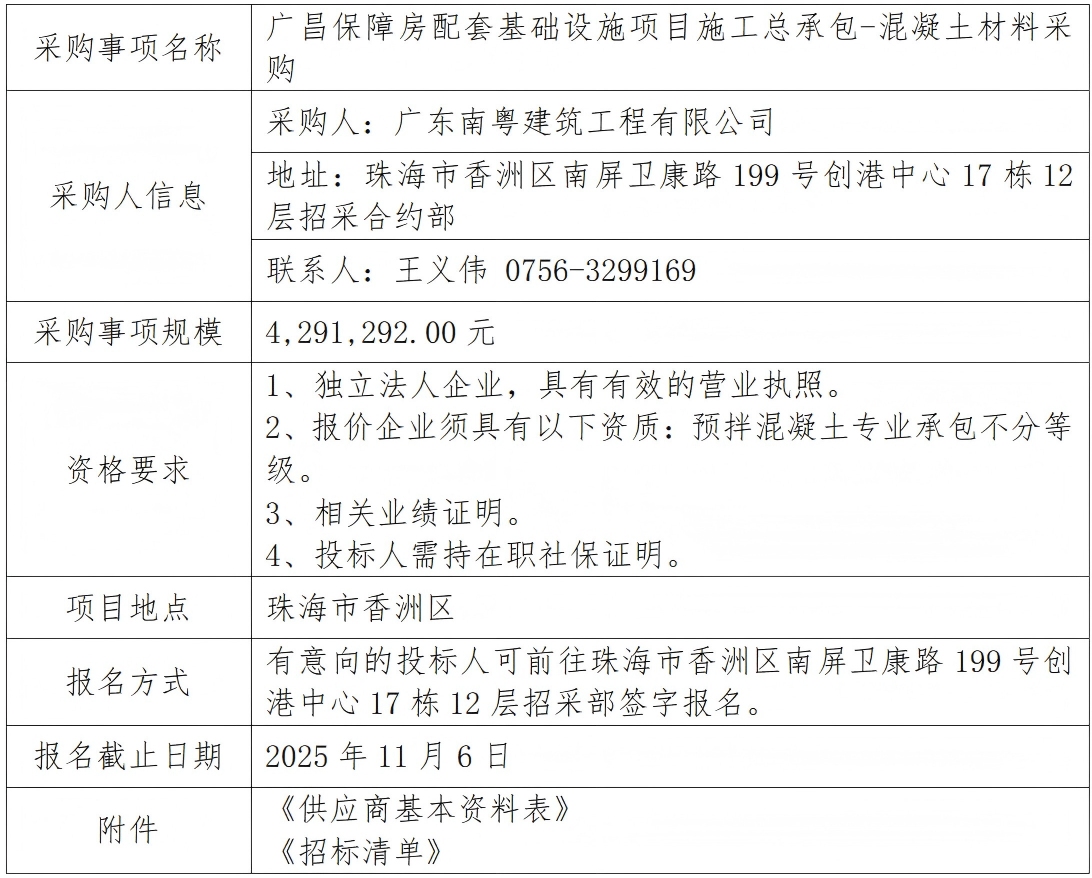 廣昌保障房配套基礎(chǔ)設(shè)施項(xiàng)目施工總承包-混凝土材料采購 專欄:工程招標(biāo) 發(fā)布日期: 2025-11-03 作者:招采管理中心 附件:供應(yīng)商基本資料表 附件:廣昌保障房配套基礎(chǔ)設(shè)施項(xiàng)目施工總承包-混凝土材料采購招標(biāo)清單 返回列表 上一篇:廣昌保障房配套基礎(chǔ)設(shè)施項(xiàng)目施工總承包-實(shí)名制系統(tǒng)考勤機(jī)升級(jí)、環(huán)境監(jiān)測系統(tǒng)、視頻監(jiān)控 下一篇:鳳凰山山地步道項(xiàng)目(香山湖公園至海天公園段)-全線整改、維修工程專業(yè)分包(延期公示)