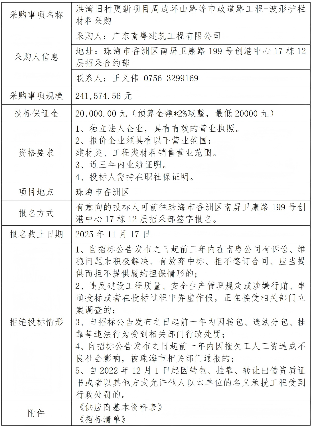 洪灣舊村更新項目周邊環(huán)山路等市政道路工程-波形護欄材料采購