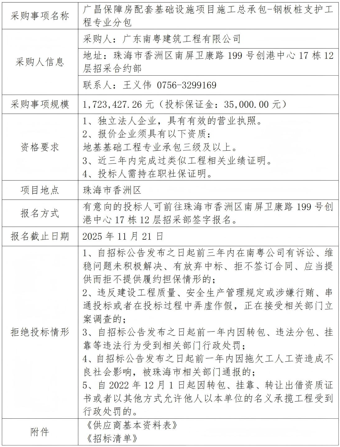 廣昌保障房配套基礎(chǔ)設(shè)施項(xiàng)目施工總承包-鋼板樁支護(hù)工程專(zhuān)業(yè)分包 專(zhuān)欄:工程招標(biāo) 發(fā)布日期: 2025-11-19 作者:招采管理中心 附件:供應(yīng)商基本資料表 附件:廣昌保障房配套基礎(chǔ)設(shè)施項(xiàng)目施工總承包-鋼板樁支護(hù)工程專(zhuān)業(yè)分包招標(biāo)清單 返回列表 上一篇:沒(méi)有了 下一篇:廣昌保障房配套基礎(chǔ)設(shè)施項(xiàng)目施工總承包--軟基處理工程專(zhuān)業(yè)分包(施工技術(shù)要求調(diào)整)