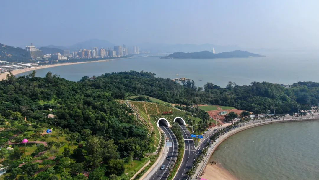 菱角咀隧道不僅對情侶中路線形進行“截彎取直”,起到緩解節(jié)假日交通擁堵,提升道路通行能力的作用,還將周邊的海濱公園、城市陽臺、香爐灣沙灘、海濱泳場、愛情郵局等濱海景觀串聯(lián)起來,打造良好的慢行環(huán)境,凸顯了珠海“山、海、城”一體的景觀特色。