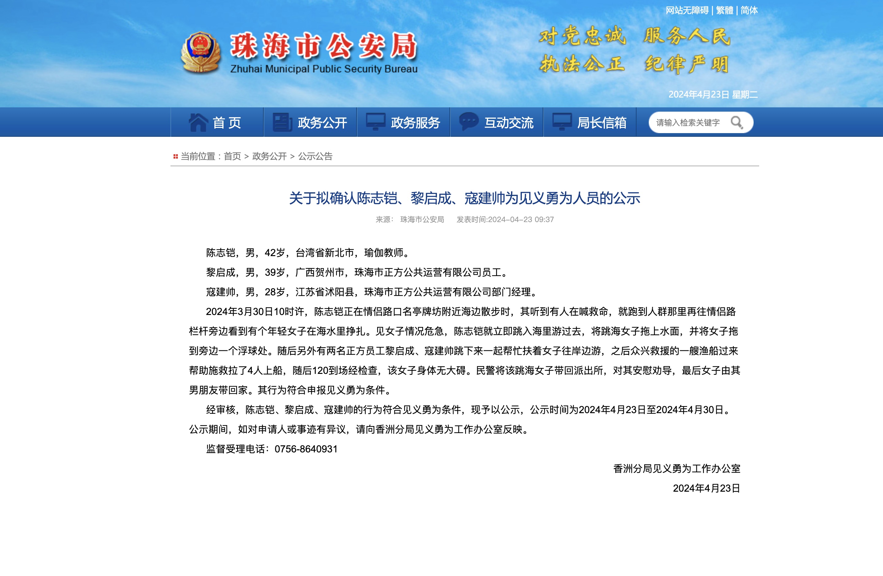 近日,珠海市公安局發(fā)布公示,陳志鎧、黎啟成、寇建帥跳海救人的行為符合見義勇為條件,確認(rèn)三人為見義勇為人員。