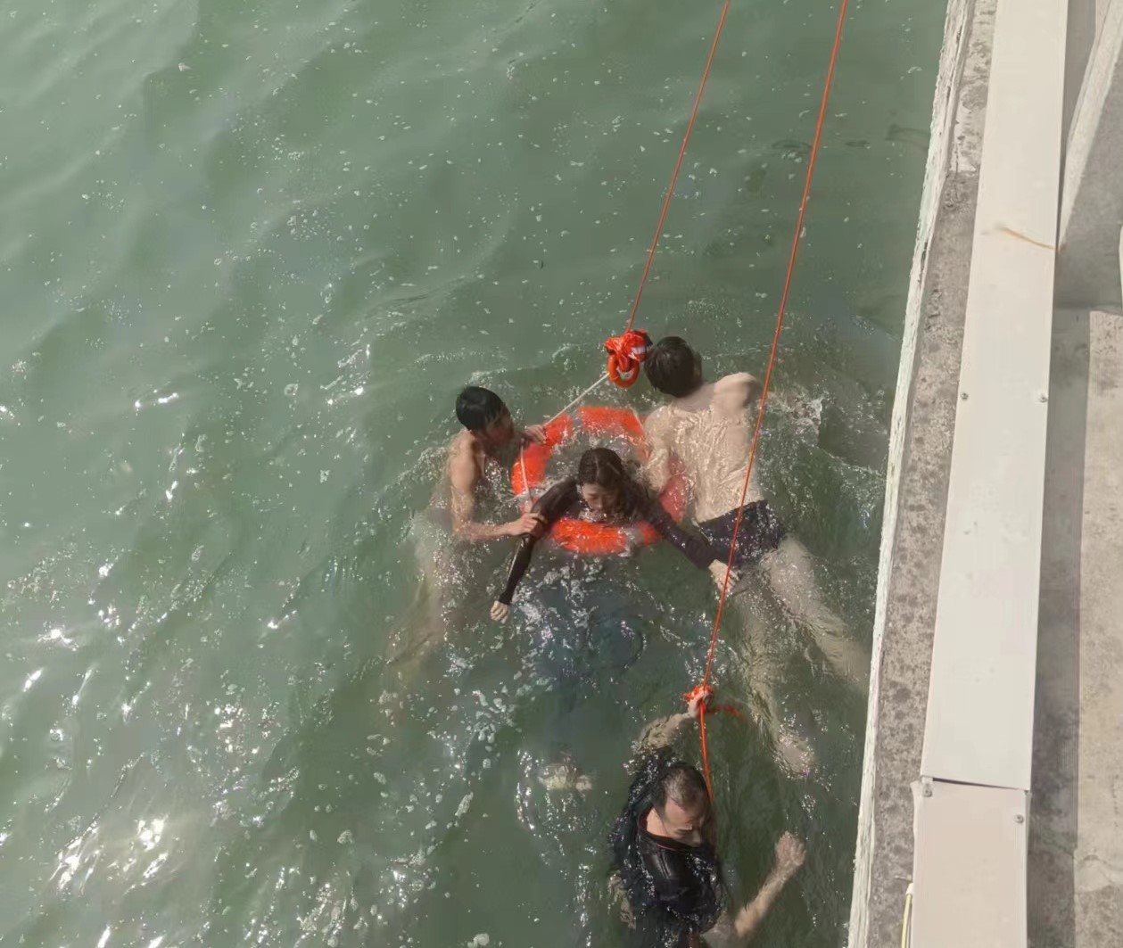 到達(dá)現(xiàn)場(chǎng)后,寇建帥看到落水女子在海水里掙扎沉浮,散步經(jīng)過的路人陳志鎧已先行跳入水中救人,并將海邊平臺(tái)常備的救生圈套在女子身上。水情復(fù)雜,女子因體力不支開始出現(xiàn)神志不清的情況,陳志鎧僅憑一人之力無法完成施救。
