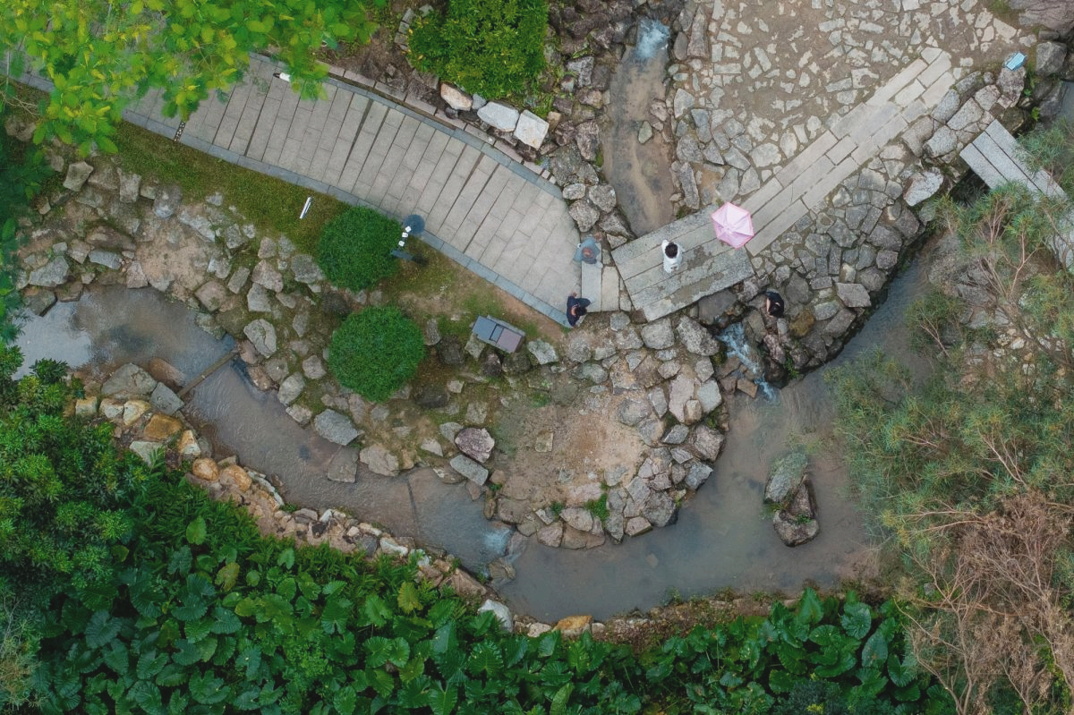 通過(guò)科學(xué)規(guī)劃引水造景補(bǔ)水設(shè)計(jì),從山腳水潭抽水至山腰水池,并對(duì)水池的水壩頂進(jìn)行精心改造,再現(xiàn)“曲水流觴”古韻,巧妙串聯(lián)起摩崖石刻、鮑俊雕像、鮑俊墓等文化節(jié)點(diǎn),形成脈絡(luò)清晰的景觀探訪動(dòng)線。這一設(shè)計(jì)不僅為山間增添了靈動(dòng)的水韻,讓市民游客能夠直觀感受自然之美,更暗合嶺南園林中“理水”的造園精髓,輔以重新整飾的綠植生態(tài)系統(tǒng),讓公園更顯嶺南風(fēng)韻,給人以沉浸式的觀賞體驗(yàn)。