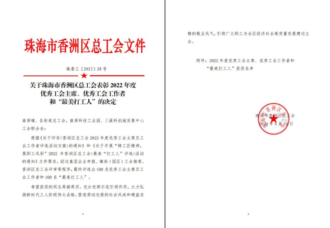 為貫徹落實黨的二十大和習(xí)近平總書記在廣東考察時的重要講話精神,緊扣珠海市“產(chǎn)業(yè)第一”工作總抓手,扎實推進(jìn)產(chǎn)業(yè)工人隊伍建設(shè)改革,引領(lǐng)廣大職工為全區(qū)經(jīng)濟(jì)社會高質(zhì)量發(fā)展建功立業(yè)。4月28日香洲區(qū)總工會對 2022年度“助力產(chǎn)業(yè)·雙創(chuàng)雙評”系列活動中獲評“優(yōu)秀工會主席”、“優(yōu)秀工會工作者”和“最美打工人”的個人進(jìn)行頒獎。正方集團(tuán)獲獎職工代表參與頒獎儀式。